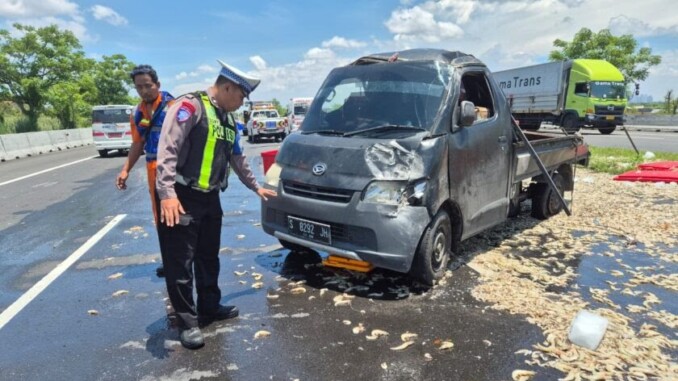 SURABAYA-Pada Minggu (15/2/2026) siang, terjadi kecelakaan mobil pikap yang membawa muatan udang windu di Tol Gresik arah Surabaya, tepatnya di sekitar KM 6.600. Akibat insiden tersebut, muatan udang tumpah dan menutupi lajur kanan jalan tol.