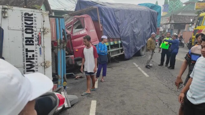 MOJOKERTO’Kecelakaan beruntun yang melibatkan empat kendaraan terjadi di Jalan Raya Desa Pacing, Kecamatan Bangsal, Kabupaten Mojokerto, pada Kamis (19/2/2026).kejadian terjadi sekitar pukul 05.00 WIB Insiden tersebut diduga karena pengemudi truk gandeng yang mengantuk hingga kehilangan kendali.